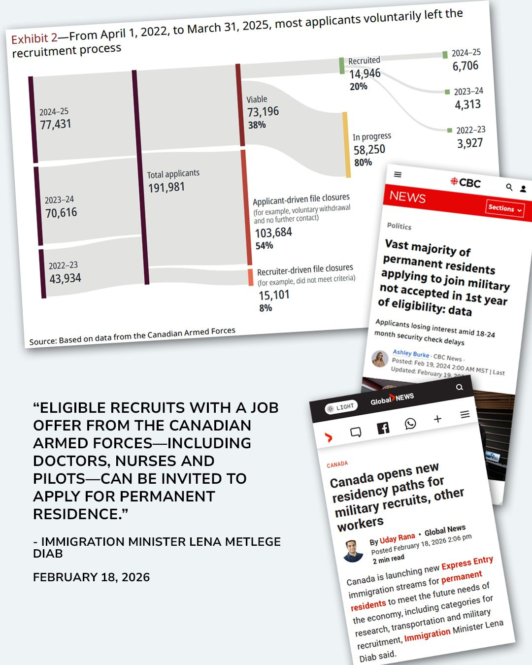 On February 18, 2026, Immigration Minister Lena Metlege Diab announced a program under which people who served in foreign armies and have a job offer from the Canadian Armed Forces can apply to become permanent residents.
